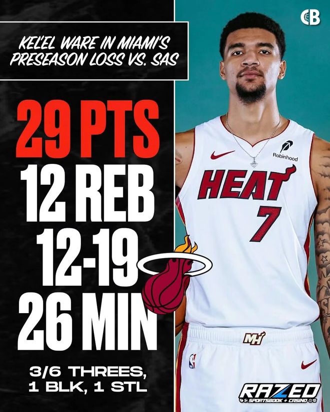 热火季前赛107-112不敌马刺-4,吞下三连败,但南滩球迷却仿佛提前收到了最好的新年礼物——二年级中锋克莱尔·韦尔用一场震惊四座的表演,让整个NBA开始重新审视这支球队的潜力。